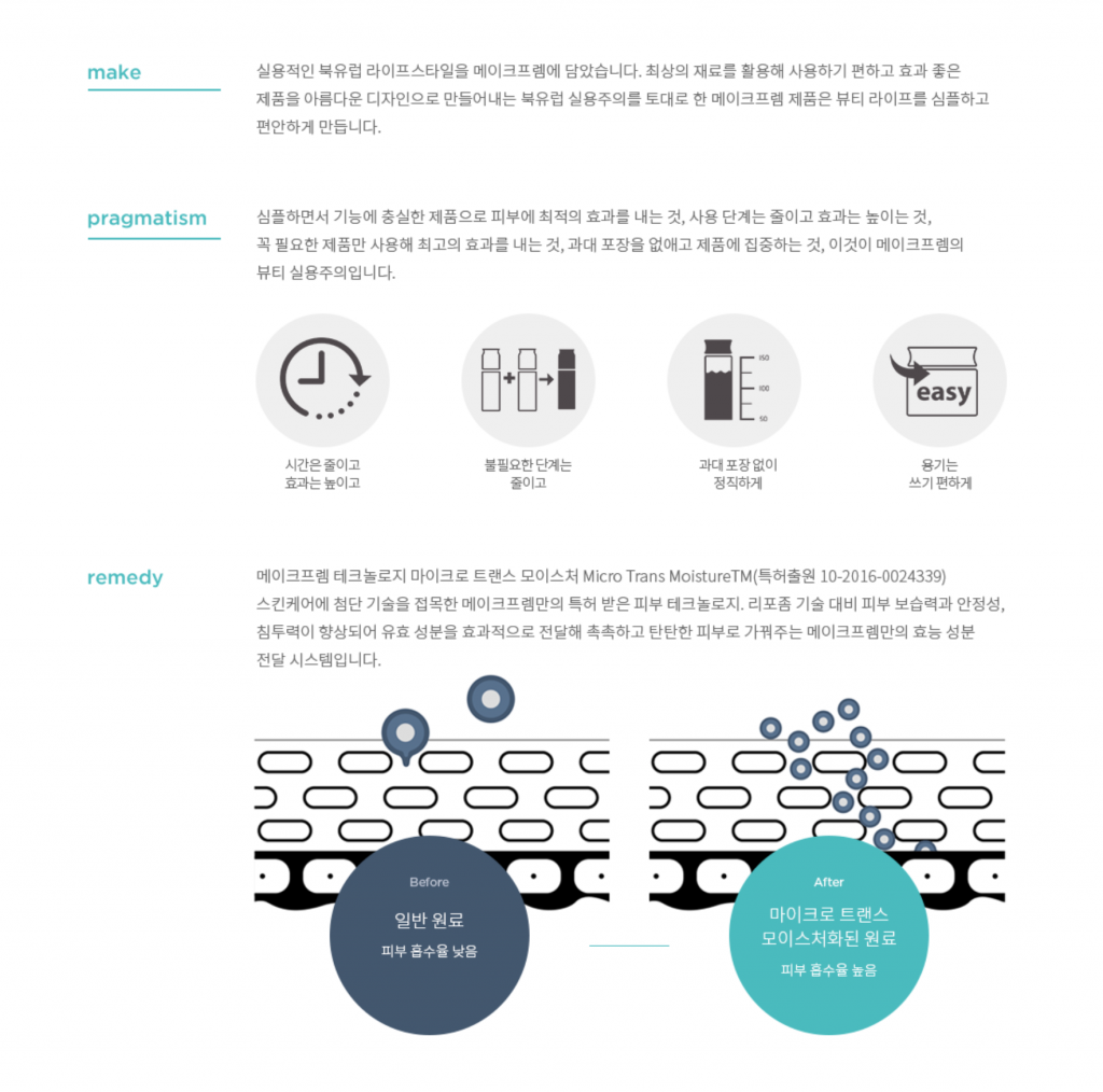 Make Prem engineering science Micro Trans Moisture™ (Patent Application x-2016-0024339) Make Prem's patented skin technology that combines advanced technology with skincare. Compared to the Liposome technology, skin moisturizing power, stability, and penetration powder, stability and penetration power are improved, effectively delivering active ingredients to brand moist and firm skin."